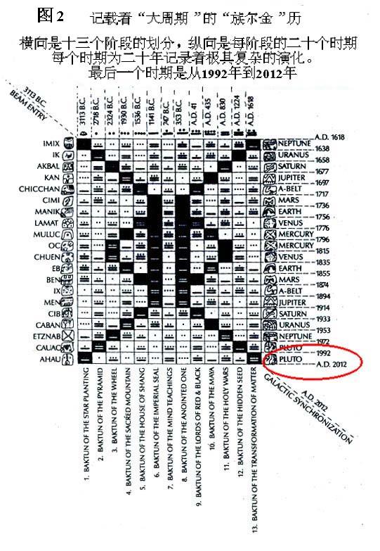 从图2中我们可以看到,从1992年到2012年这二十年的时期中,我们的地球已进入了“大周期”最后阶段的最后一个时期。玛雅人认为这是“同化银河系”前的一个十分重要的时期,他们称之为“地球更新期” (EarthRegeneration Period)。在这个时期中地球要完全达到净化(EarthPurification)。而“地球更新期”过后地球将走出银河射线的范围而进入“同化银河系”的新阶段。何西博士还结合中国的《周易》和遗传密码等理论从不同角度上用了非常复杂的手法来探讨、解释这一天象所给与人类的启示。