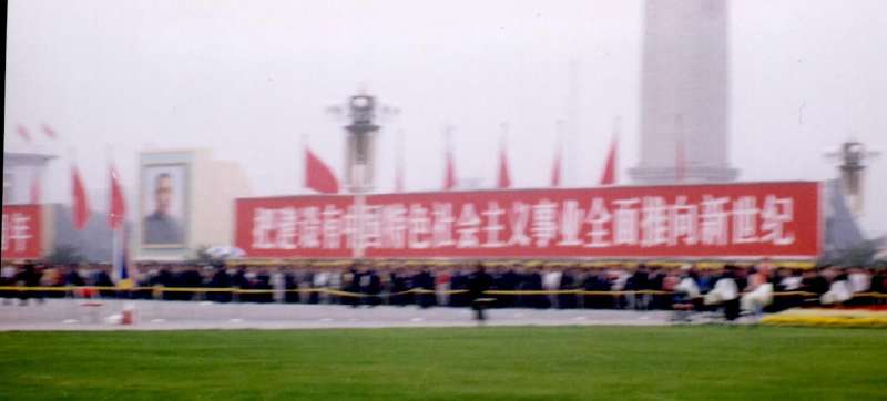 十月一日的天安门广场乌云笼罩,广场四周布满了警察和警车。刚刚举行完升旗仪式,广场上就聚集了成千上万的游人。