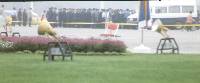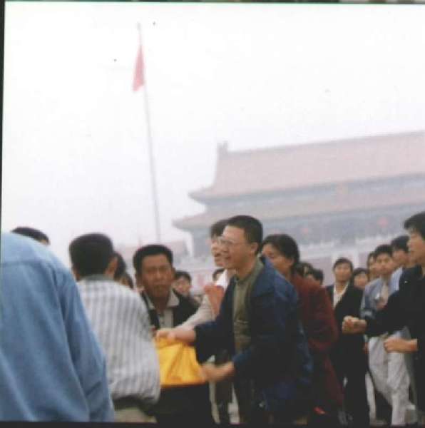 三点十分左右有三十多位身穿黄色背心上写"真善忍"的学员打出了大法横幅,并向群众散发了宣传材料,这些学员都被抓,现场有外国记者照相。没多久又有几起学员打开大法横幅,其中有些学员身穿白色背心上写"真善忍",在广场上跑了二十多米,也被他们抓走,共约有五十多人。
