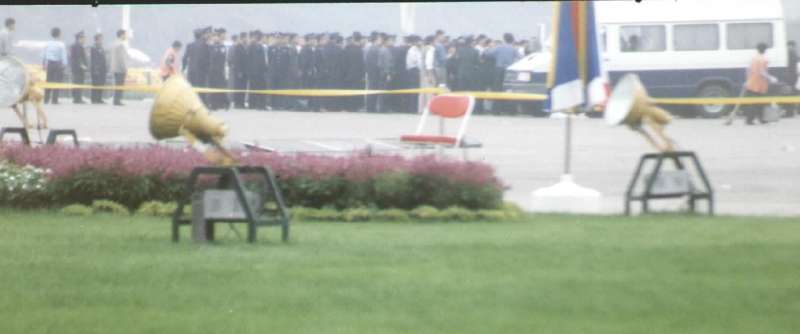 早上八点左右有学员来到天安门,这时广场已经戒严,禁止游人进入。这些学员站在金水桥一边,警察甚至不让游人接近路边的栏杆,必须离开一米以上。警察驾驶摩托车来回巡视,有人往广场远望,警察立刻呵斥:"有什么好看的,不许看!"借口人太多不让滞留,当然更不让游人往广场方向照相。这时看见一辆辆警车往广场里开,不久后装了学员的警车一辆辆离开广场。他们还看见三辆大型的清洁车开出广场,后来进广场后发现喷水池靠大会堂一边地上全是水。广场不时有动静,一有情况一群便衣(约五六十人)从广场的一侧冲向另一侧;而且还有警察从天安门路边冲向地下通道赶往广场增援,有的干脆直接跳进地下通道。
