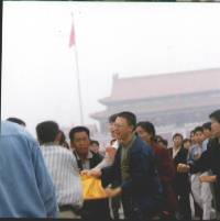 约九点四十分,学员绕道进入广场。看见警察和便衣在零星地抓捕学员,甚至一辆车刚装三、四个学员就开走了。有不少学员一边走一边大声喊:"法轮大法好!"警察就抓走了他们。有一个女学员不愿上车,警察硬是把她拉了上去。当时有很多群众围观。有一个学员绕过警车告诉围观的群众:车上抓的都是法轮功学员,他们修真善忍,却不让他们修。警察冲上来把他抓上车去。还看见一辆车装了20个左右学员,其中有白发苍苍的老太太,也有风华正茂的年轻人。他们在车上不顾警察和便衣的阻止,不时拉开车窗告诉围观的群众:"法轮大法好!法轮大法是正法!"。这时有五六个衣服很脏的盲流和流氓在一个胖便衣的带领下高声叫喊:"打倒xx功!打倒xx功"而且嘴上不时地说着脏话。与此形成鲜明对照的是,我们的学员心态很好,一个个面带微笑,拉开车窗齐声高呼:"法轮大法好!法轮大法是正法!"。其中有一个学员指着被利用的流氓和盲流说:"你们不要受人欺骗!"
