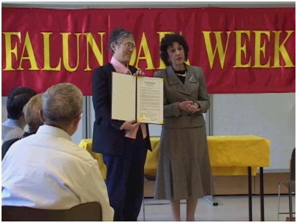 褒奖仪式结束之后,市长愉快地同学员们合影,并参加了其后举行的法轮功介绍会。在观看了介绍法轮功的短录像带和李洪志老师的教功录像带之后,市长和另外几位到场人士一同饶有兴趣地学习了第一套功法。她告诉学员,她的感觉好极了。她认为每个人都需要这样有益于身心的活动。