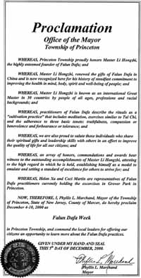十二月五日下午,新泽西州普林斯顿市长菲莉斯.玛查德女士在公共图书馆会议厅,宣读了对法轮大法和李洪志大师褒奖的公告,并宣布2000年12月4-10日为该市“法轮大法周”。二十余位法轮功学员和当地居民参加了这一庆祝活动。市长在公告中高度评价了李洪志大师所做出的巨大贡献,表达了对他的最崇高的敬意,同时也高度赞扬了修炼法轮大法给人们所带来的巨大的身心益处。市长讲话之后,学员宣读了感谢信并做了功法演示。