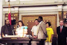 市议员路易斯-瑞德(Lewis Reed)先生亲自在会议上宣读了该决议,并发表了讲话。他说作为美国人,很自然会把信仰自由等基本人权当作理所当然的事,但在中国大陆那样的社会形态中,面对中共[江氏]政府的残忍迫害而仍敢于坚持自己的信仰,那才是真正的有信仰的人,为此他要褒奖法轮功和法轮功学员的努力。他的助手摩利先生也即兴作了简短发言,表示为法轮功的精神所感动。随后,瑞德先生将镶着精美镜框的决议原本颁发给学员代表。西人学员邦妮-丹那根致词,代表圣路易市法轮功学员感谢市议会的支持。