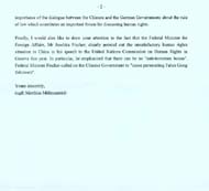 最后,我也想请你了解这一事实,联邦外交部长费舍尔(Joshika Fisher)先生今年在日内瓦联合国人权委员会上发言,明确指出中国令人不满的人权状况。他特别强调了不能钻“反恐的空子”。联邦部长费舍尔要求中国政府“停止迫害法轮功学员”。