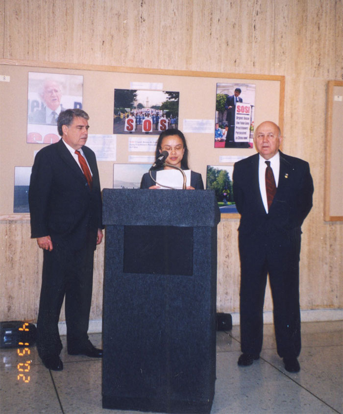 最后发言的一位学员介绍了图片展的背景和中国政府对法轮功学员残酷迫害的最新情况和数据,并揭露了自己的母亲因修炼法轮大法已被江泽民政府关押超过两个月,现在不知身在何处的事实,大家都十分关切。开幕式后麦克尼尼议员更是详细询问了很多细节。
