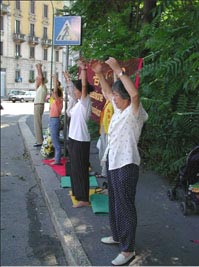 【明慧网2002年7月31日】2002年7月20日,星期六,阳光明媚,法轮功学员们在中国驻米兰领事馆前和平请愿,捍卫真、善、忍原则,同时向意大利民众