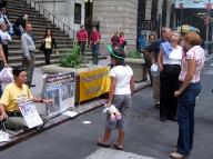 一位西方妇女,长时间的站立在那里打着横幅,记者问她累不累,她表示没有关系,她从德国来,因英语不是那么好,她打横幅可让其他英文好的学员去讲真象。据另一位德国学员介绍说:为了让这个经济、金融之都的人们了解法轮功真象,几位学员不约而同的从德国自己居住的城市来到了纽约,他们是在这里相识的。另外,一对来自美国德州的夫妇,从早到晚坚持不懈在这里讲真象。一些西海岸的老年法轮功学员不辞辛苦的在这里承担起提供真象资料供应的任务,因没有汽车,那些资料都是乘地铁一趟趟提来的。年轻的法轮功学员都是牺牲了自己的假期来到这里的。
