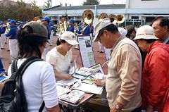 观众们被“天国乐团”整齐威严的阵势和优美的演奏深深震撼,有人认真看着真相展板,有人详细读着真相资料,有的在营救受迫害法轮功学员、谴责中共活摘法轮功学员器官的征签表上签名;有的华人当场声明退出中共恶党的相关组织。