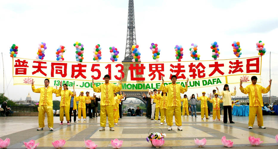 法轮功学员制作的巨大横幅“普天同庆世界法轮大法日”,每个字长、宽均为一米,下配有法文和两朵美丽盛开的莲花,从很远处就吸引到游人的目光。印有法轮大法好的彩色氢气球悬吊起横幅,缤纷的色彩让人赏心悦目。
