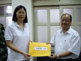 ![]() 法轮功学员、人权律师朱婉琪二十八日下午前往立法院递送陈情书, 由立法院秘书处副处长郑健中代为收下 |