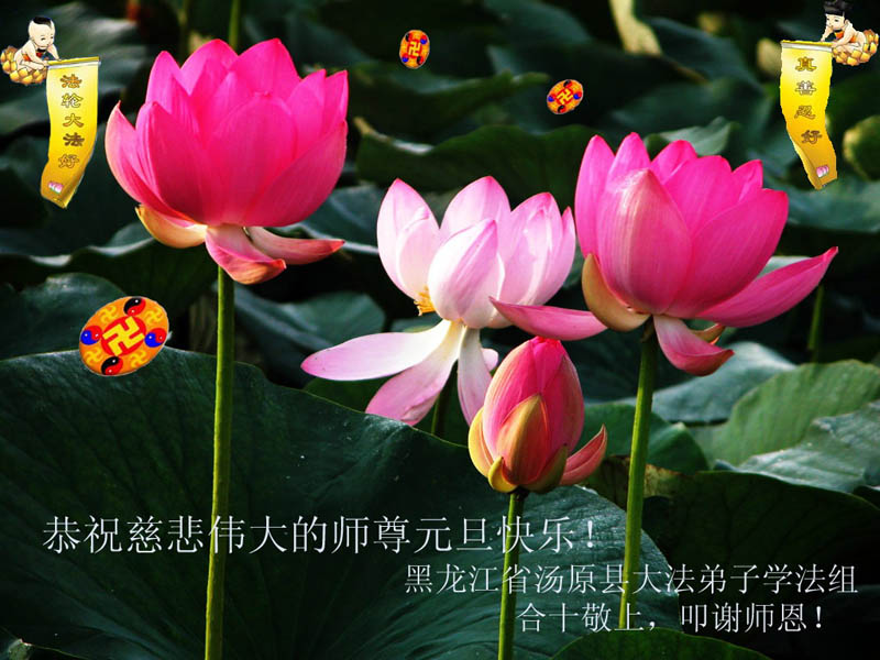 最崇敬的伟大师尊:新年好!在新的一年来临之际,在正法的最后不多的时间里,我们大法弟子一定努力做好三件事,坚持组织集体学法,耐心的向世人讲清真相,完成我们的史前洪愿,决不辜负师尊对我们的殷切期望。