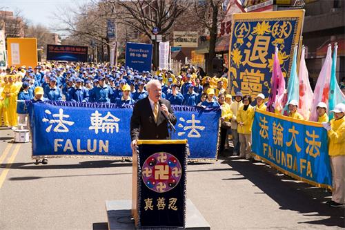 纽约州参议员艾维乐在集会上表示,佩服法轮功学员坚持信仰,也很高兴有三亿多的中国民众退出党团队,追求自由。他告诉民众愿意与大家(法轮功学员)站在一起,期待中国早日实现宪政和自由的这天。