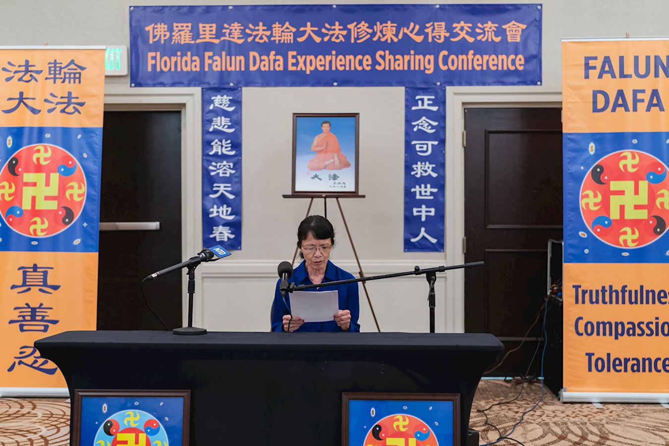 ![]() 图7:李敏瑜在佛州法会上交流了自己的修炼体会 |