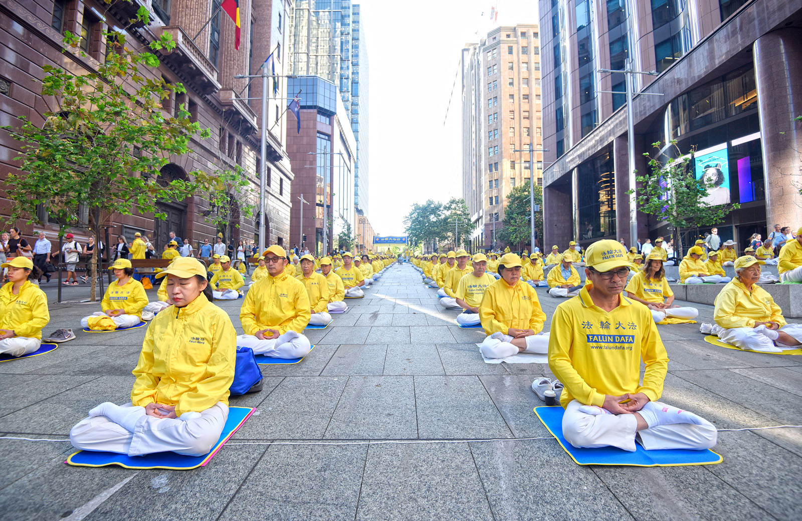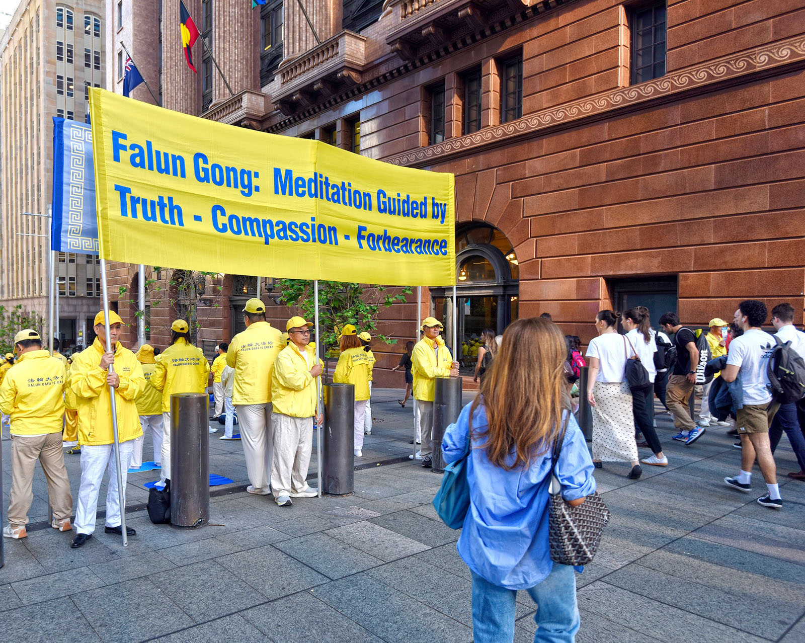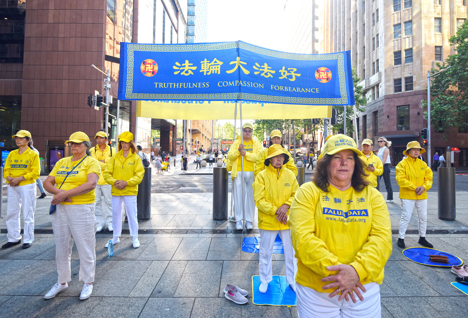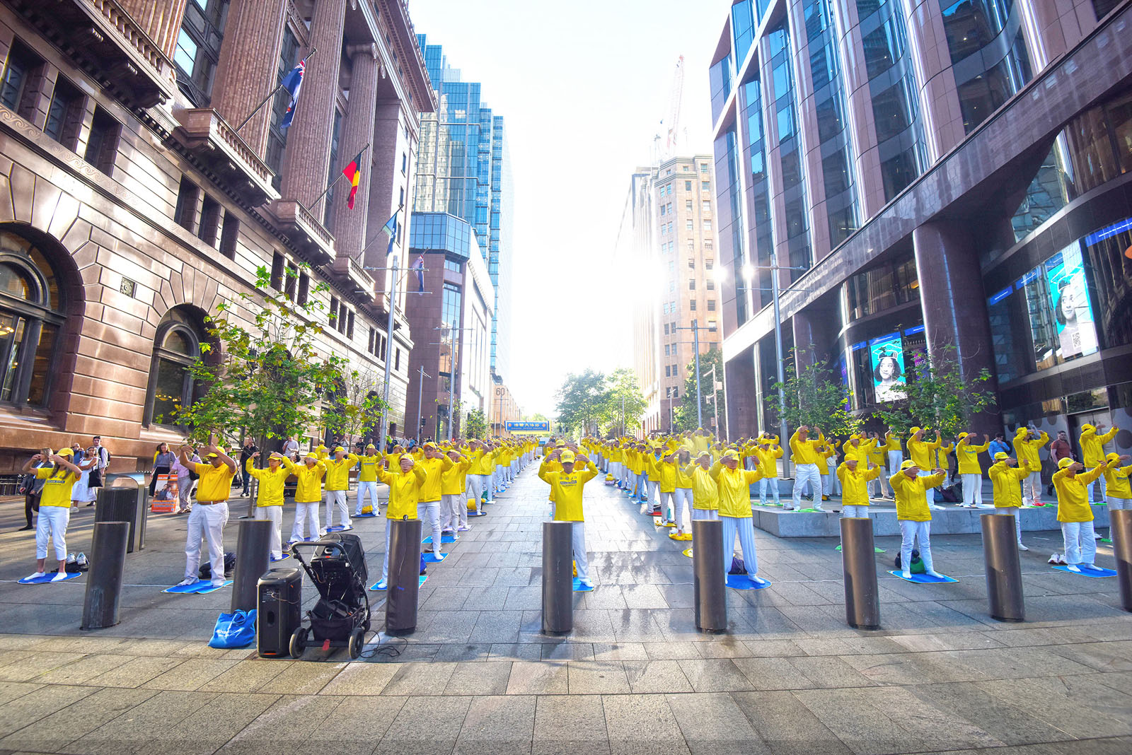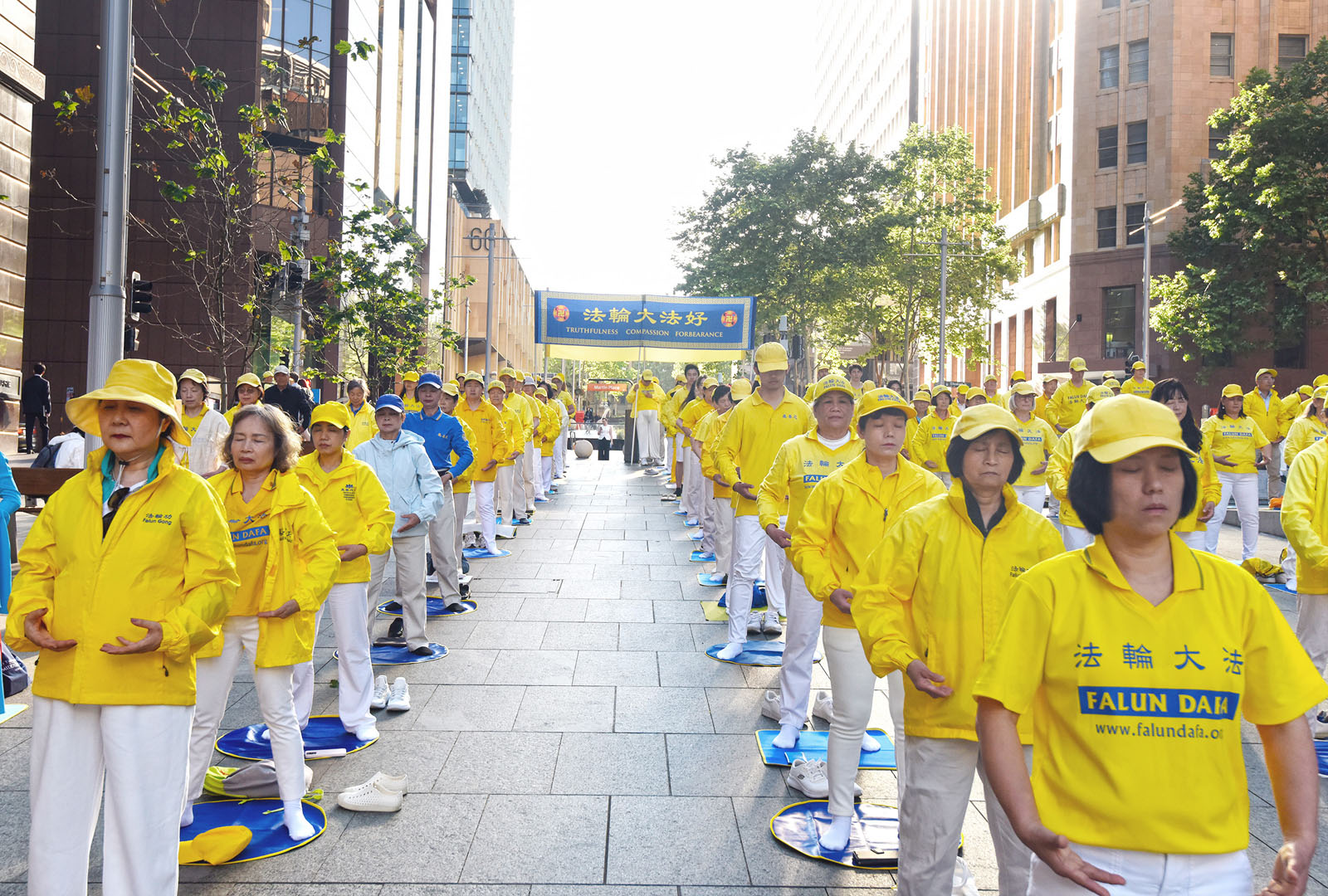 在悠扬的炼功音乐中,法轮功学员展示了舒缓的五套功法,向人们传递法轮大法的美好。清晨的灿烂阳光,洒在马丁广场,也开启了连续三天系列活动的序幕——迎接二零二五年度澳洲法轮大法修炼心得交流会的召开。晨炼之后,法轮功学员从马丁广场出发举行了大游行。
