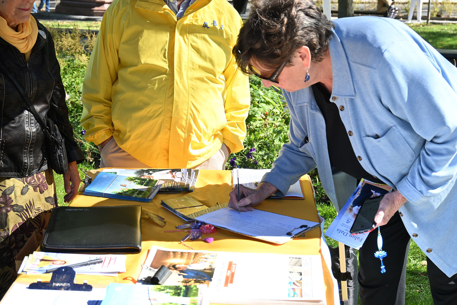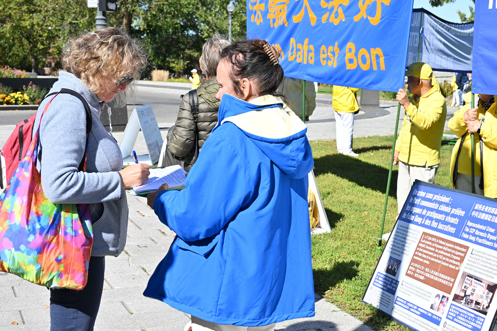 图12~15:很多民众当了解真相后,纷纷在呼吁魁北克政府不要参与中共跨国镇压法轮功的请愿书上签名声援法轮功学员。