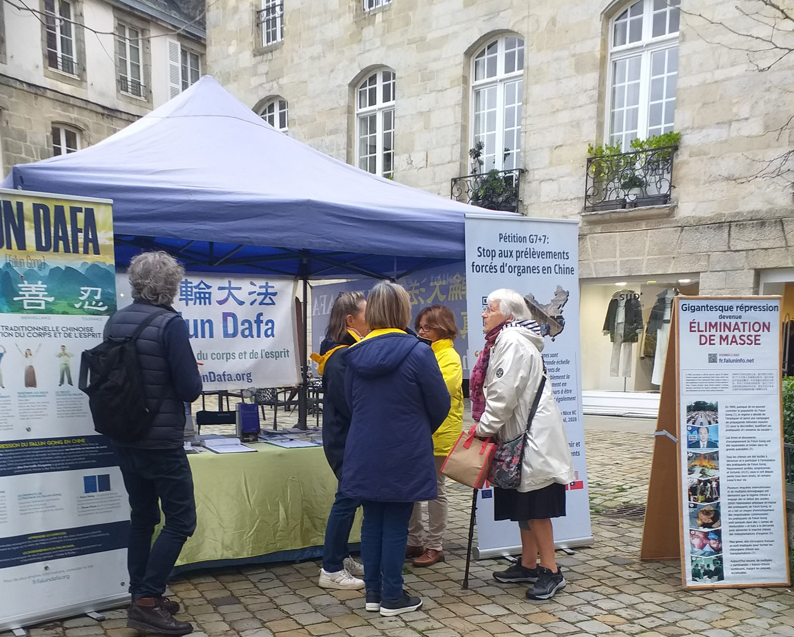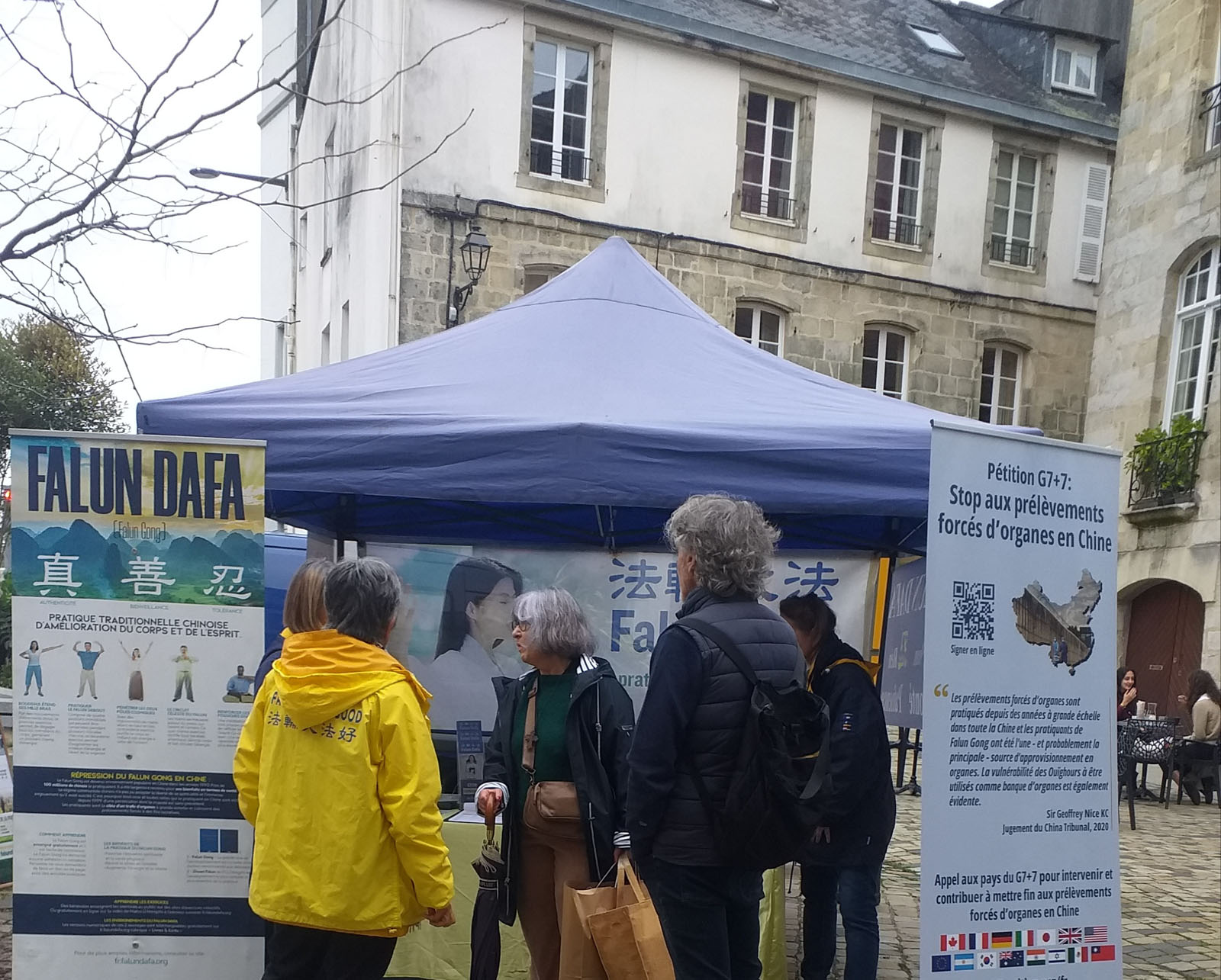 一位坎佩尔的居民夫妇接过了关于活体摘取器官的传单。先生是从事ISO(国际标准化组织)工作,他希望在网上进一步了解法轮功以及中共对法轮功学员的迫害。他也表示目前充斥很多虚假的信息,临走前也拿了明慧网关于法轮功的《明慧二十年报告》,准备传播出去。