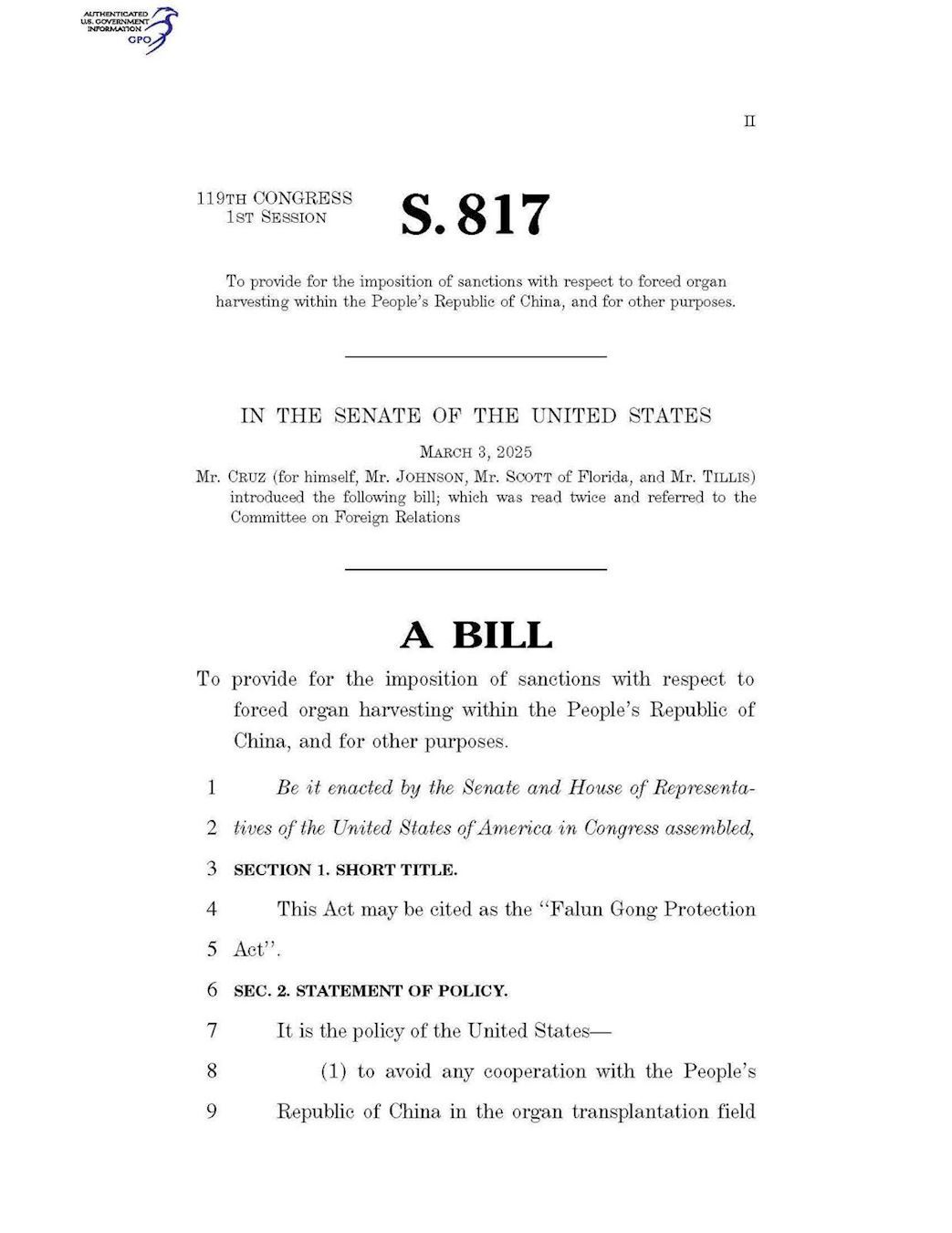 图2:由德克萨斯州共和党联邦参议员泰德·克鲁兹于今年三月三日提出的《法轮功保护法案》(S.817法案)。详细内容请点阅:https://www.congress.gov/119/bills/s817/BILLS-119s817is.xml