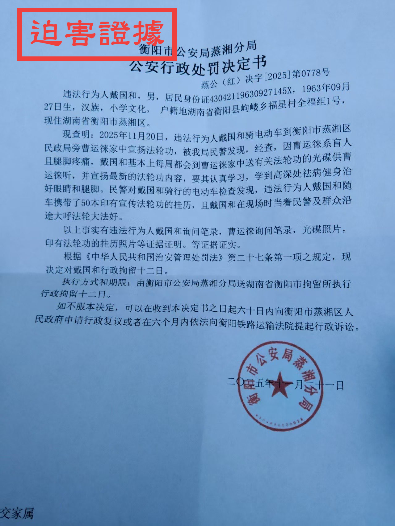 衡阳市公安局蒸湘分局的《行政处决定书》称,戴国和是“违法人”,向曹运徕提供法轮功的最新内容。法轮功的所有原著、经文和修炼者交流的最新内容,都在法轮大法网站、明慧网公开地面向全社会发布,几十种语言,为什么用中文分享给中国人就被中国警察成为“违法”呢?是中国大陆的人真的不需要真、善、忍呢?还是中共暴力剥夺了中国人信仰真善忍和受益于法轮功修炼的基本人权呢?