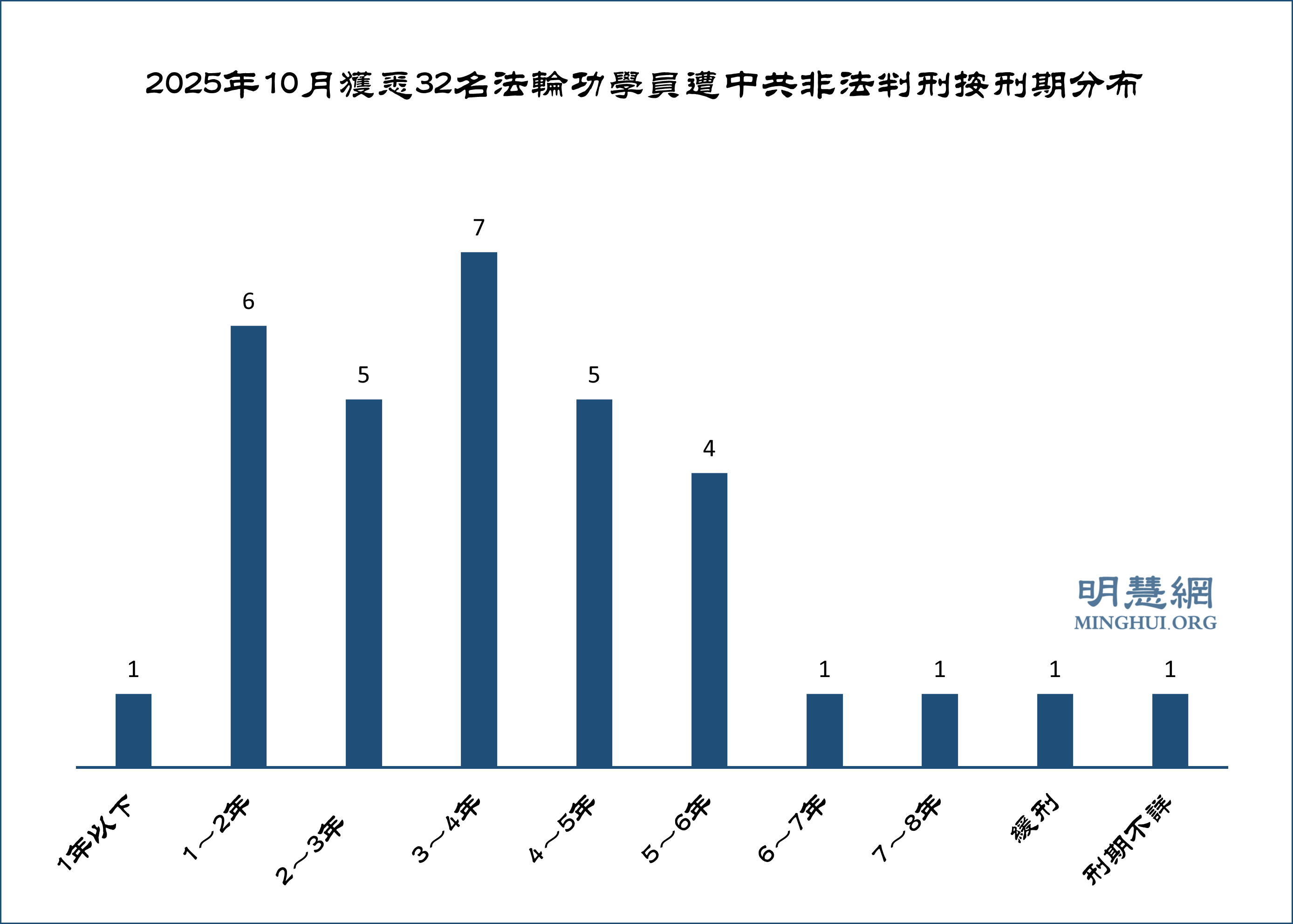 ![]() 图2:2025年10月获悉32名法轮功学员遭中共非法判刑按刑期分布 |