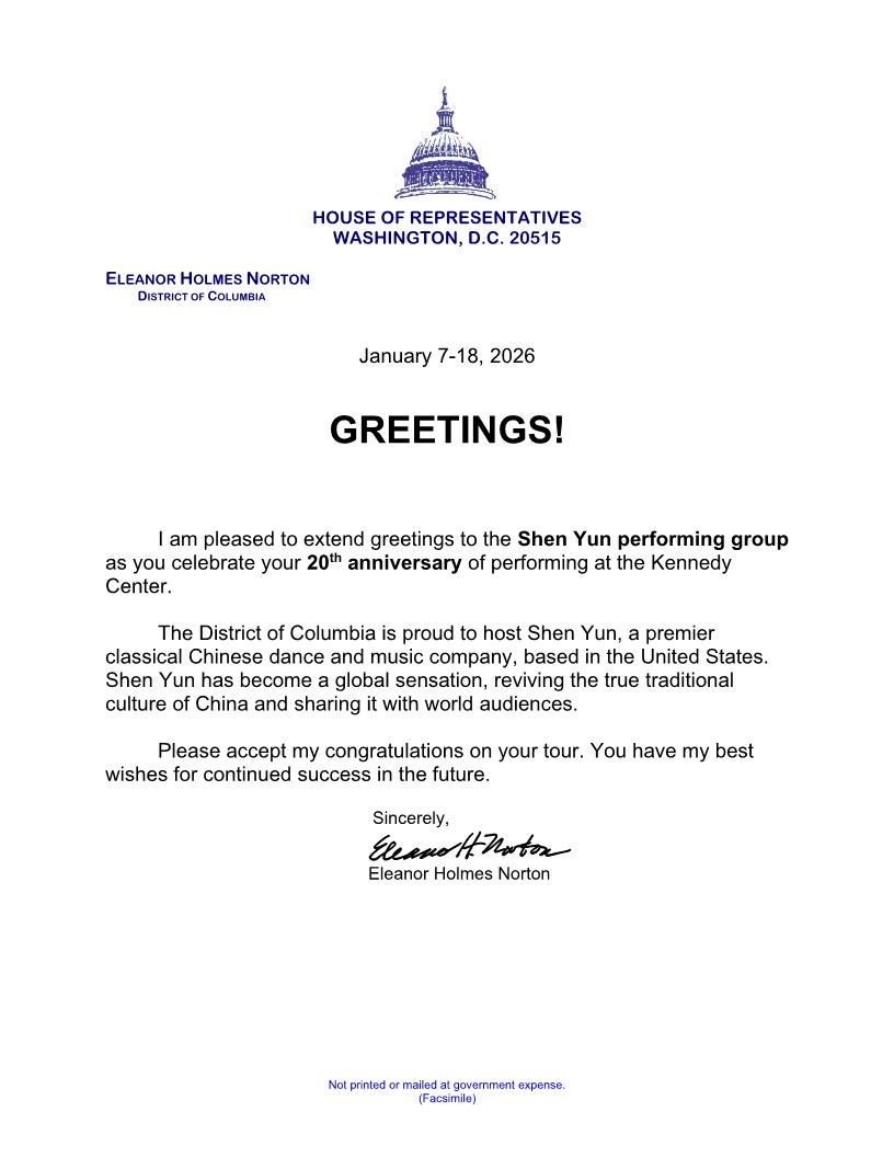 值此神韵艺术团庆祝成立二十周年之际,并在肯尼迪中心演出,我很高兴向你们致以祝贺。