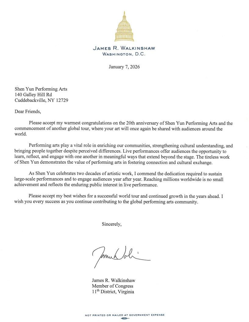 沃金肖议员说,神韵艺术团的不懈努力,彰显了表演艺术在促进联系与文化交流方面的价值,他赞赏神韵的奉献精神,年复一年地维持规模庞大的演出,并吸引观众。