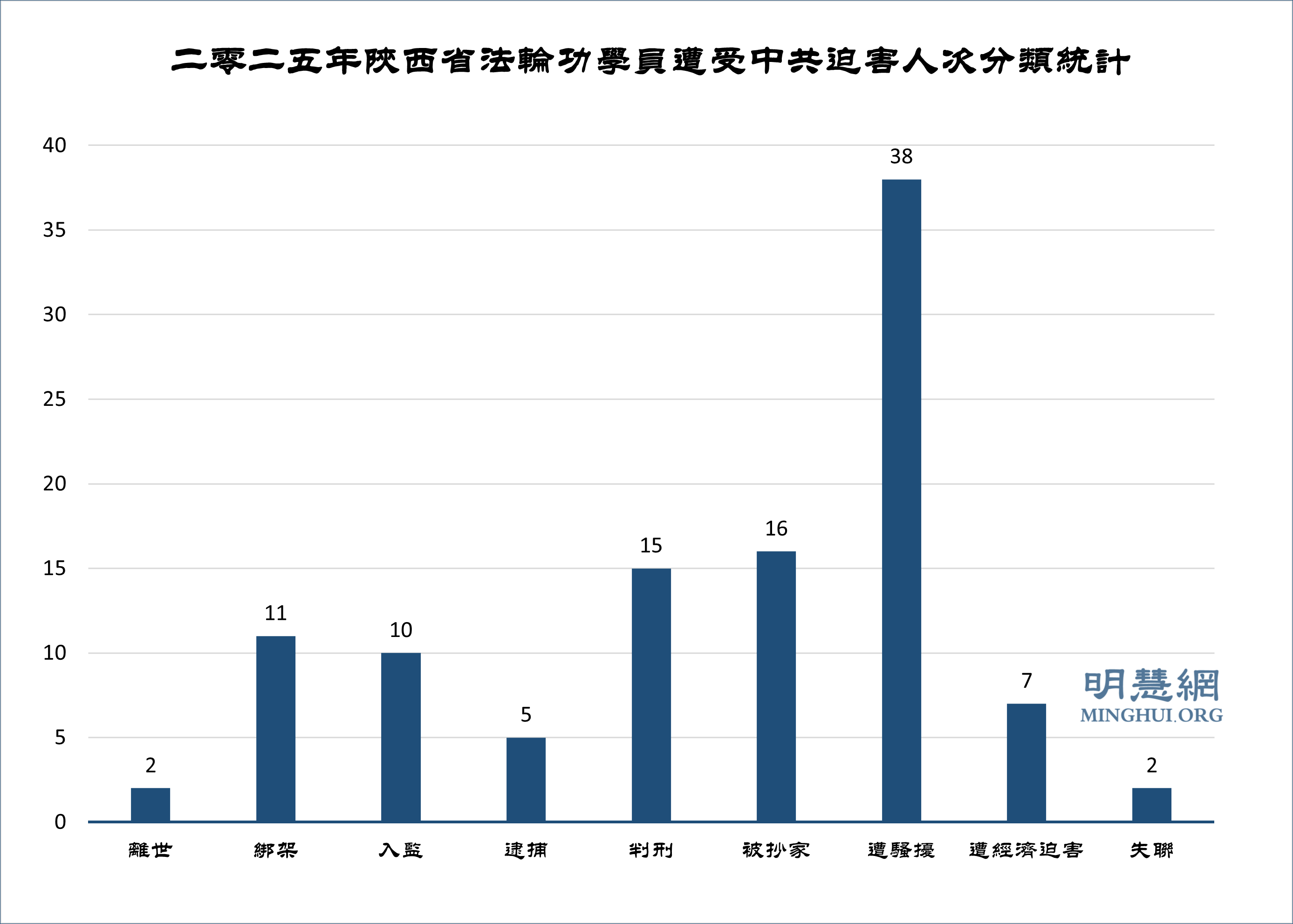 ![]() 图2:二零二五年陕西省法轮功学员遭受中共迫害人次分类统计 |