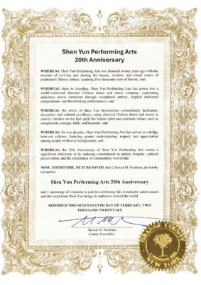 鉴于:神韵艺术团二十周年庆典标志着其在艺术纯粹性、文化传承及全球社区文化滋养方面永续承诺的重要里程碑;