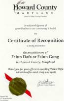 马里兰州哈伍德郡郡长授予法轮大法荣誉证书
