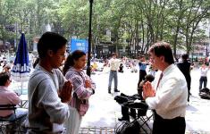 中午时分庆祝活动正式开始。首先由各种族学员依次用英文、西班牙文、法文、俄文和中文的代表用本国语言致贺词,接下来的集体功法演示吸引了很多人。有的路人找到讲法语或西班牙语的学员开始交谈;有的向学员索取中文的大法简介,并道出了一番心里话:我知道这个在中国是被禁止的,可是有那么多人在炼,一定有他的好处。当他得知每个周末都有法轮功的炼功人到他家附近的公园里炼功时,一再地说:“太好了!太好了!”;还有的人说,炼功动作都是自学的,今天是第一次见到这么多炼法轮功的人,一份找到归属的心情溢于言表;有个西方人拿着手里的大法简介说:“你别只是给我简介,跟我介绍,告诉我现在去哪儿可以学呀?”虽然我们不知道这位过路人原打算去哪儿,可我们现在看到的是她站在那里认真地学着法轮功。在炼功场地的一角,有两个英文组、一个中文组及一个西班牙文组在教功。