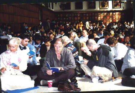 法会是在著名的多伦多大学圆形毕业大礼堂里举行的。主席台布置得和去年一样。就在去年的这个时候,就在这同一个主席台上,我们最尊敬的师父第二次为加拿大和其他远道赶来的弟子们讲 法。