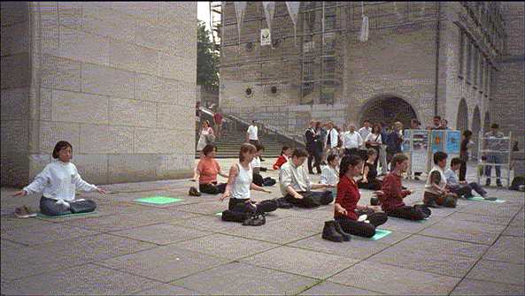 二零零零年五月十三日,和世界上所有的法轮大法修炼者一样,比利时的大法学员怀着万分喜悦的心情迎来了第一个世界法轮大法日.经警察局的批准,我们在位于布鲁塞尔市中心的 Mont des Arts广场, 进行集体炼功和弘法,与全世界的大法弟子们一起,共庆这伟大的节日. 学员们挂起了中.英.法三种 文字的横幅:世界法轮大法日,法轮大法,真善忍.远远望去,壮观神圣.学员们亲手制作的法文横幅"世界法轮大法日"格外引人注目.在为这次活动而赶制的展板上,贴着法轮大法的图片介绍和世界各地的炼功活动. 大法书籍及大法资料整齐地摆放在搭起的架子上.