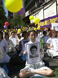 千名法轮功学员,昨日由捧着五十位受虐致死的法轮功学员遗照的人员前导,在曼哈坦第三大道上安静肃穆的步行。