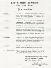 【明慧网2001年1月23日】 乔治亚州石头山市宣布2001年1月为“法轮大法月”