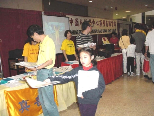 法轮功展台独家设置了投影电视,播放法轮功五套功法,并伴有法轮功学员现场炼功,优美的音乐和动作吸引众多游客伫立观看,不少人对法轮功产生浓厚的兴趣,纷纷上前询问如何学习,几千份中英文免费法轮功学习班传单、法轮功真相报纸等材料一扫而空。