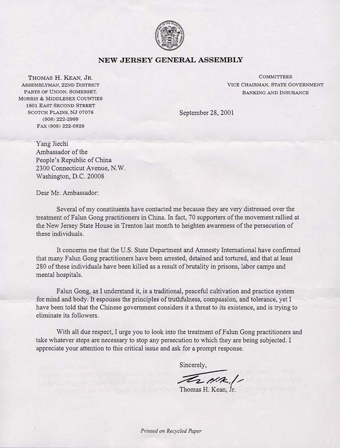 感谢您就中国当前的人权状况给我写信。对中国政府对法轮功学员的处理,我与您一样感到忧虑。