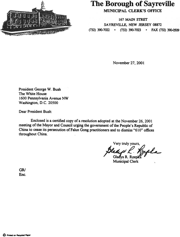 【明慧网2001年12月8日】2001年11月26日,新泽西州的赛瑞维尔市(Sayreville)市议会在市政厅召开了全体大会,一致表决通过了关于支持法轮功,敦促中华人民共和国(江泽民)政府停止对法轮功学员的迫害和解散全国范围内的“610”办公室的决议。决议认为:江泽民政权对法轮功学员系统的升级的迫害和洗脑是恐怖的,是违反了中国自己的《宪法》以及《国际民权和政治权利条约》和《世界人权公约》;决议还特别提到35名西方法轮功学员在天安门广场为法轮功功和平请愿;会议决定将决议副本寄给联合国秘书长安南,总统布什等6位美国高级官员及江泽民等8位中国高级官员,以表达作为一个美国普通城市官员与市民对这场镇压的明确态度和关切。