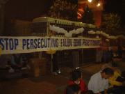 烛光、大法音乐、花环、白花、彩旗、横幅、标语板、汽车开过的唰唰之声,夜空闪烁的星点……,汇织了一幅动人的夜景。当晚,有20多个弟子坚持通宵守候在现场,渡过了这个不寻常的夜晚。