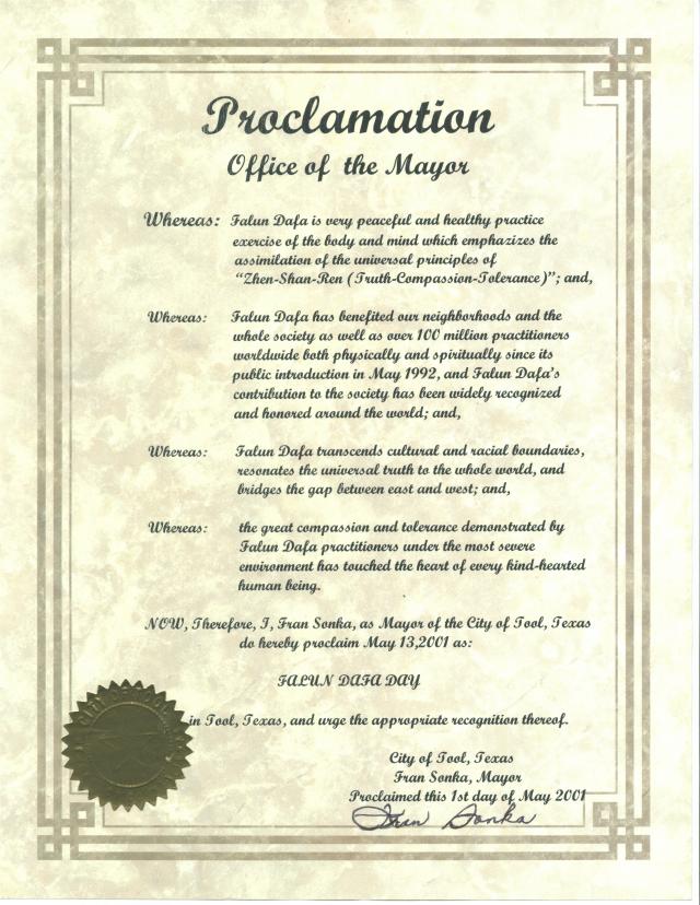 • 德克萨斯州托尔市宣布“法轮大法日”