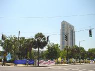 功法表演后,进行了近两个小时的沿街游行。所过之处吸引了很多过往的车辆,他们鸣笛向学员们祝贺。有的司机停下来询问,并拿走了资料和传单。游行之中我们停下来再次向行人作洪法表演。报社的记者也跟着我们游行并拍摄照片。