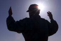 图一:一种中式炼习的冥想功法-法轮功的一位修炼者,在沙漠微风公园持续地保持着一种姿势。