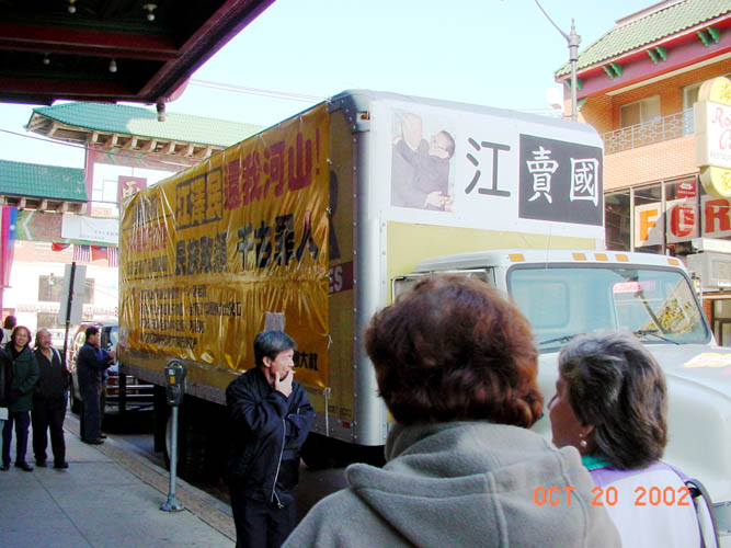 巨型标语悬挂在卡车的四周,上写道“江XX还我河山”,“被江贼出卖的领土相当于几十个台湾”,“承认图门江出海口属于俄国,封死了中国东北出海口”,“中国边防军再后撤100公里,不设防,为俄国对中国的蚕食大开方便之门”等语句,谴责江XX与俄罗斯,哈萨克和塔吉克斯等国签订的一系列卖国边境协定。这两辆卡车分别停放在华埠广场前和“天下为公”的牌楼下,路人纷纷驻足观看。