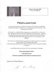 里隆女士认真听取了我们的介绍,并以极大的兴趣观看了“正法之路”图片展及其他大法图片。她还观看了功法演示,并长时间与学员交谈。当她了解到中国江氏流氓集团对无辜法轮功学员的残酷镇压情况后,立刻毫不犹豫地表示要在请愿书上签名。我们为市长、议员及其他各界要人准备了特殊的请愿书,这是我们在北昆士兰的旅程中第一次遇到政府官员主动要求签署请愿书。