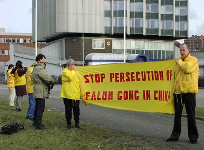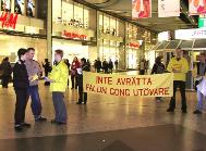 学员们打开了一位大法弟子连夜赶制的横幅:“切勿枪杀法轮功学员”,向过路的行人递发瑞典学员写给瑞典首相和外交部长的公开信。很快,几百份公开信一发而光,然后学员们分散开来,以我们的善念,向人们揭露发生在中国的邪恶和真相。
