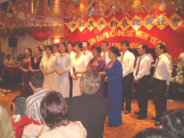 宴会期间好戏不断,与观众的欢声笑语融汇一起。应邀前来参加宴会的嘉宾,有澳洲联合组织执行董事(United Nation Association of Australia)、纽省政府官员、市长及多位市议员、律师、大学教授、艺术家、商业人士、多家媒体代表、澳洲国庆日委员会(AUSTRALIA DAY COUNCIL)纽省协调人、(ROTARY CLUB)澳洲分部蓝山区协调人及非政府组织(NGOS)协调人等百余人。他们与悉尼地区3百多位法轮功学员及家属一起共进晚宴,在品尝尤具中国南方特色之美味佳肴的同时,欣赏由法轮功学员自编、自导、自演的古典音乐、歌曲独唱、合唱、男女声二重唱、儿童舞蹈、法轮功五套功法示范、民族服装表演等多项文艺节目,精彩的表演展现了法轮功学员对美好事物,对真诚、善良、容忍,对生命需要“真善忍”的理解及实践。舞蹈学校的朋友也前来助兴,表演宫廷舞蹈。轻松自然、不拘一格的演出博得一阵阵的喝彩与掌声。
