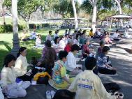 图片:加拿大安大略省的两个小城滑铁卢(Waterloo)和凯基那(Kitchener)的大法弟子以户外野餐、公园洪法、步行发传单,庆祝法轮大法洪传世界十周年这普天同庆的节日。