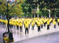 五月十七日(星期五)一大早就一直阴雨不断,真令人心中不快,跟着到了九点左右,学校陆续宣布停止教职员工的趣味竞赛以及学生的班际2000公尺的大队接力比赛,这个情势似乎很不妙,当天预定在上午十一点到十一点半举行三十分钟的功法表演。到了十点,学员们陆陆续续的进入了校门,并已在校园内洪法、发传单、讲清真相,十点半左右,学员已超过了百人,大家先在礼堂中放置随身物品,并做休息与准备,此时大家一致决定风雨无阻的进行本次的活动。到了十点四十五分开始整队进入会场,十一点开始准时功法表演,此时虽然阴雨依旧,却已小了许多,唯一遗憾的是录音机却出了状况,在不断的毁损录音带及更换录音机及录音带之下,总算度过了这一关,结束时却也耽误了十分钟之多。这是我们正念的不足所致,一定要向内去找。值得一提的是,学员们情绪并未受影响,此情况一致获得在场教职员工们的赞叹与惊讶。