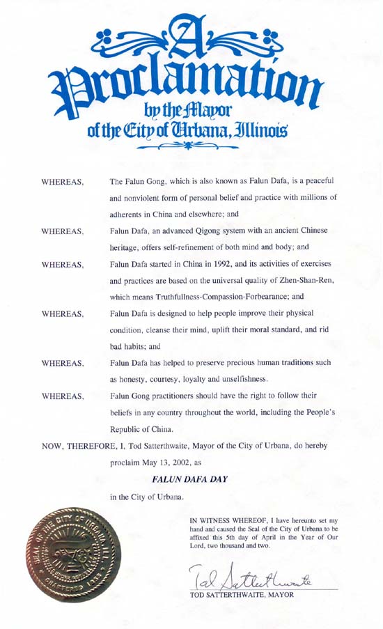 鉴于,法轮大法的目的是帮助人们改善他们的身体状况,纯净他们的思想,提高他们的道德标准,摒弃陋习;并且