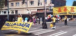 第8个游行-湖城“先锋日”游行,是美国西北地区最大的表演性游行之一。学员们齐心合作,金光闪闪的大法横幅,整齐的队形,悠扬的炼功音乐,第一和第五套功法的表演,加上三位身着传统中国服装的女大法弟子,向世人展示了大法和大法弟子的风貌。法轮功游行队伍荣获了成年方队表演组的第一名奖。