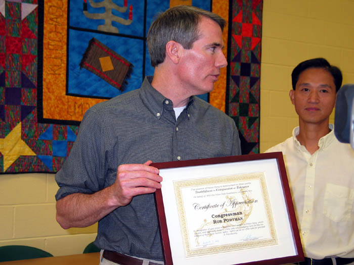 Rob Portman 议员随即发言,表示非常感谢法轮功学员向他介绍在中国发生的事情。他说,国会420票赞成对0票反对通过188决议案,这在议会史上也是罕有的意见一致。2002年7月24日通过的188号决议案呼吁北京政府停止迫害法轮功,并要求中国驻美机构停止对修炼法轮功的美国公民和居民的骚扰,并停止其向美国官员施压以使其拒绝或收回对法轮功及其修炼者的支持。